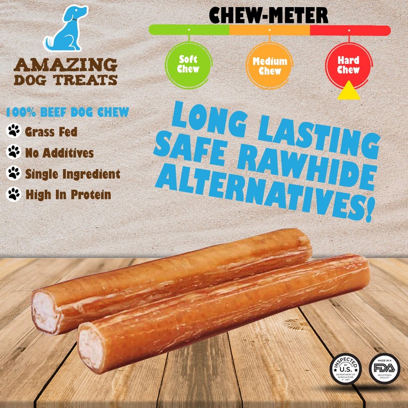 - HIGH IN PROTEIN: Bully Sticks are high in protein, and low in fat content. Amazing Dog Treats offers multiple different size bully stick alternatives for you and your pup. Thinner sticks for the more sensitive chewers, and thicker sticks for the larger breeds. We even have bully stick bubble bites for those looking for a short-term reward chew.