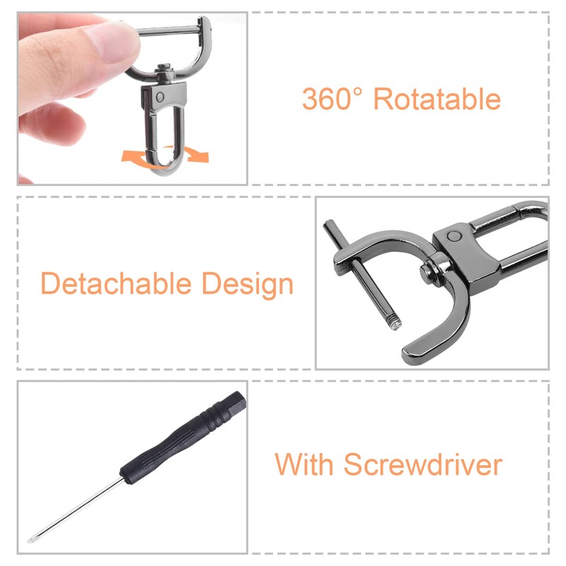 - Detachable Design: D-Rings swivel lobster buckles are equipped with a screwdrive, you can easily remove the screws of the D-rings lobster clasp with a screwdriver. Swivel lobster clasp can rotate 360 degree, can very flexible to rotate key chain in any direction