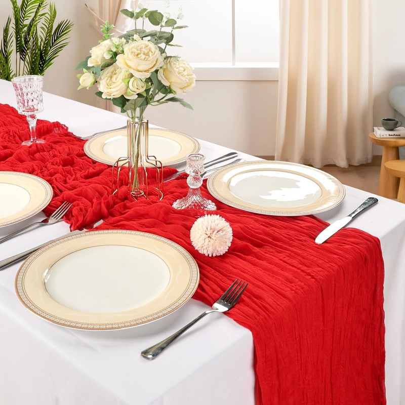- Premium Material: Crafted from high-quality polyester, this red cheesecloth table runner offers exceptional durability and easy maintenance. It combines the natural texture of cheesecloth with the practicality of synthetic fibers for long-lasting use.