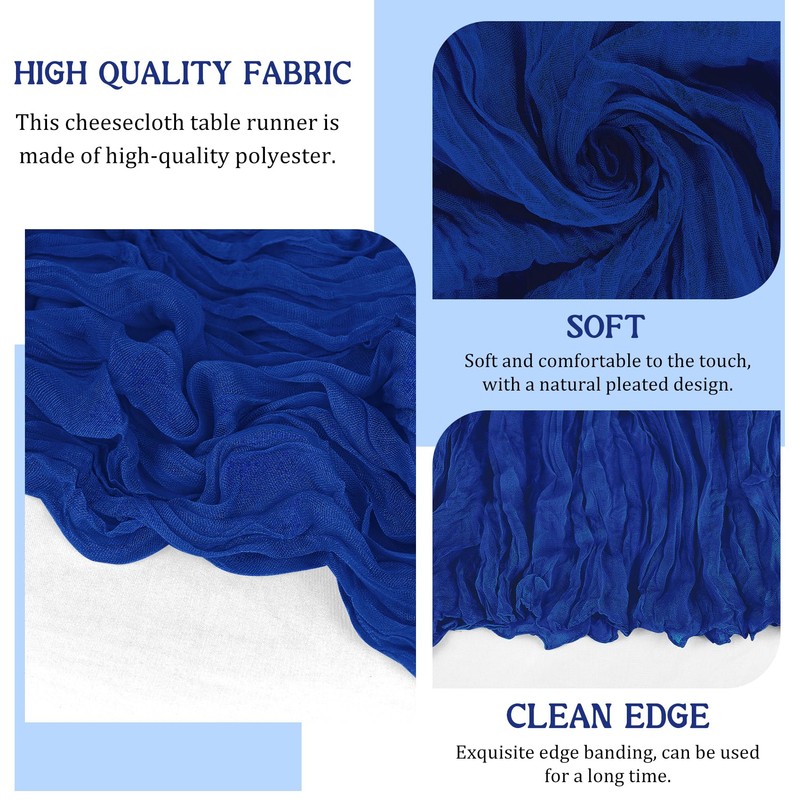 - Cheesecloth Table Runner:You will receive 6 royal blue cheesecloth table runner. Each tablecloth is made of high-quality polyester.Soft and lightweight, no pilling or fading, can be reused for a long time.Sufficient quantity to meet your daily home decoration needs.