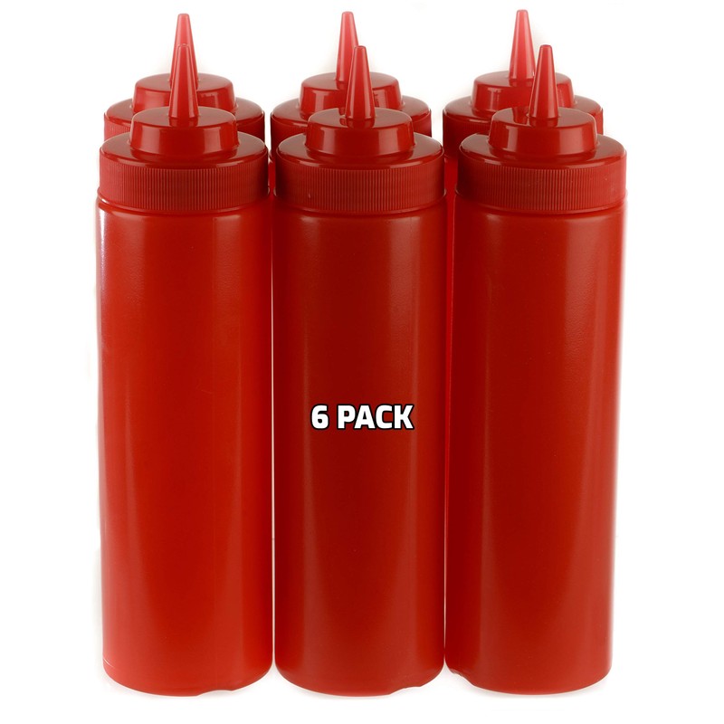 [6 PACK] 24 Oz Red Plastic Condiment Squeeze Bottles Squirt Bottle for Sauces, Dressing, Arts and Crafts, Ketchup, Mustard, Oil, BBQ - Clear Reusable Plastic Containers, BPA Free, Dishwasher Safe
