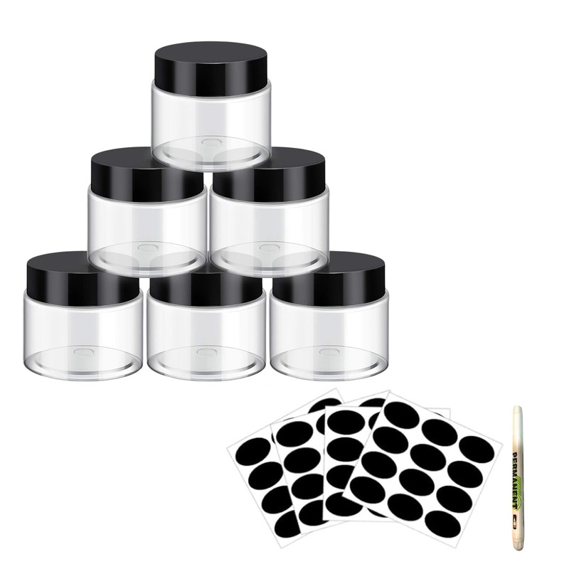 6 Pack – 4 oz / 120 ml Clear PET Jars with Black Lids | Food Storage, Cosmetics, Crafts, and More | BPA-Free, Stackable, Leak-Proof Containers. Labels and permanent marker included.