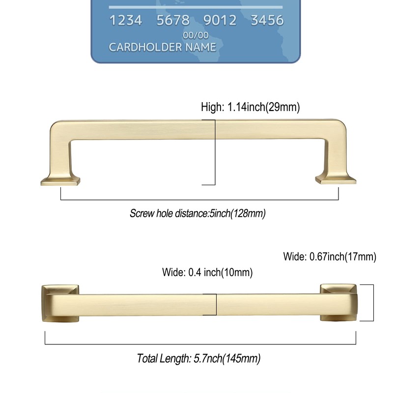 - Size of cabinet hardware: Hole Centers(CC): 5 inch(128MM); Overall Length: 5.7 inch(145MM); Height: 1.14 inch(29MM); Width: 0.4 inch(10MM). Please check the size of the kitchen handle you need carefully before you buy.