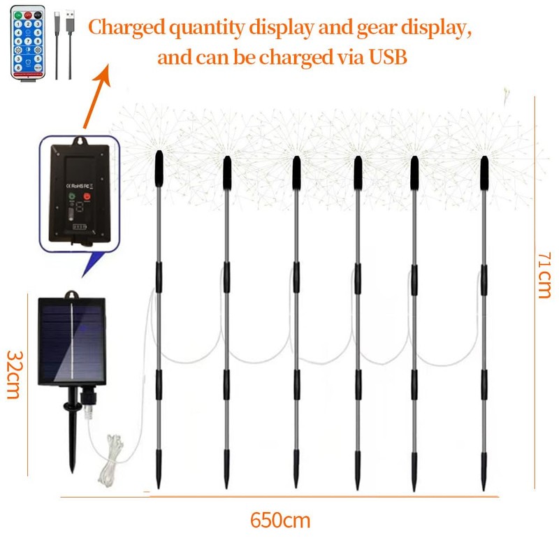 - Unsere Solarfeuerwerkslichter sind mit Ladekabeln ausgestattet, LED-Leuchten können für 12-16 Stunden nach jeder vollen Ladung arbeiten, und kommt mit einer Fernbedienung, die sehr bequem ist. Ausgestattet mit einer Leistungsanzeige 25%,50%,75%,100%.