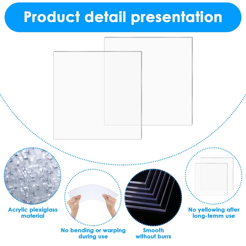 - 【Feature】Clear cast acrylic sheets have glass-like transparency and excellent optical quality, while being waterproof, weather-resistant, and UV-resistant. clear acrylic is tougher, more durable, and lighter than traditional glass. These acrylic sheets are precisely laser cut with smooth edges and no residue.