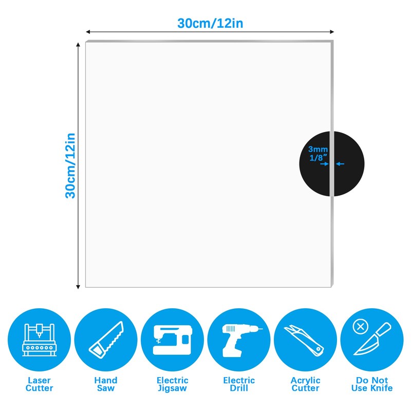 - 【Package Content】12” x 12” x 1/8” (3mm thick, including paper), 300g/0.6 6lbs — each, including 6 packs of clear acrylic sheets. Please remove the protective paper on both sides of the acrylic panel before use.