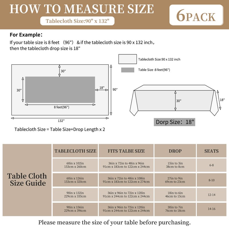 - 【Size】The size of this rectangular tablecloth is 90 x 132 Inch for standard 8ft table, providing 18 inch drop, this rectangular table cloths easily protect your tables and furniture from scratches, beverage,wine,stains and sun rays, it aslo decorate your tables and provide you with a more elegant dining environment. At the same time, our tablecloths are available in various sizes, 60*102 in, 60*126 in, 90*132 in, 90*156 in, and there is always a tablecloth suitable for 4FT-8FT table.