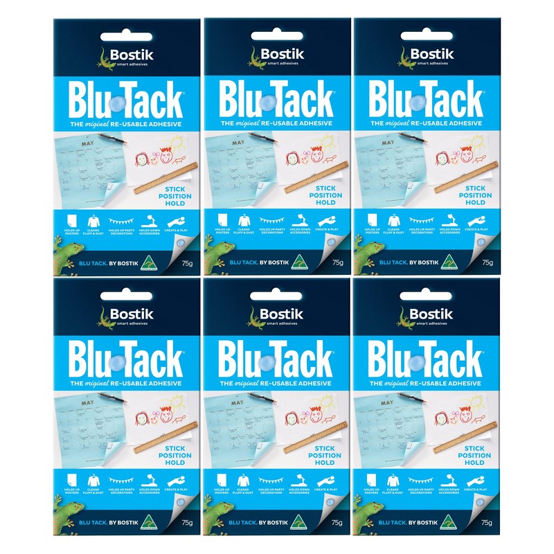 Bostic Blu-Tack is the is the original reusable adhesive. It is permanently plastic and Pliable (it can be readily formed into any shape) and each pack comes with strips for ease of use.