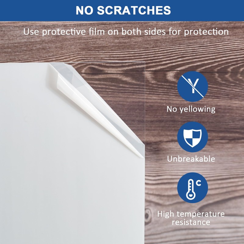 - Cutting: The 0.04In thickness of our Clear Plexiglass Sheets provides an ideal balance between flexibility and strength while cutting through them with precision tools such as Laser engraving, scissors trimming or scoring knives is a breeze due to their impressive machinability properties. There are protective films on both sides of the Clear plastic sheet to ensure that the plexiglass panel will not be scratched