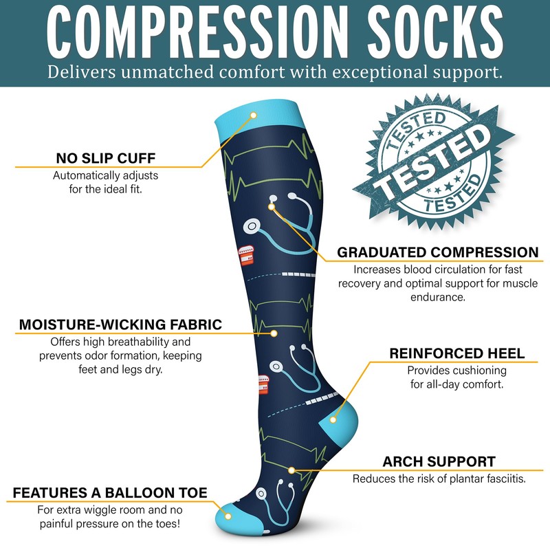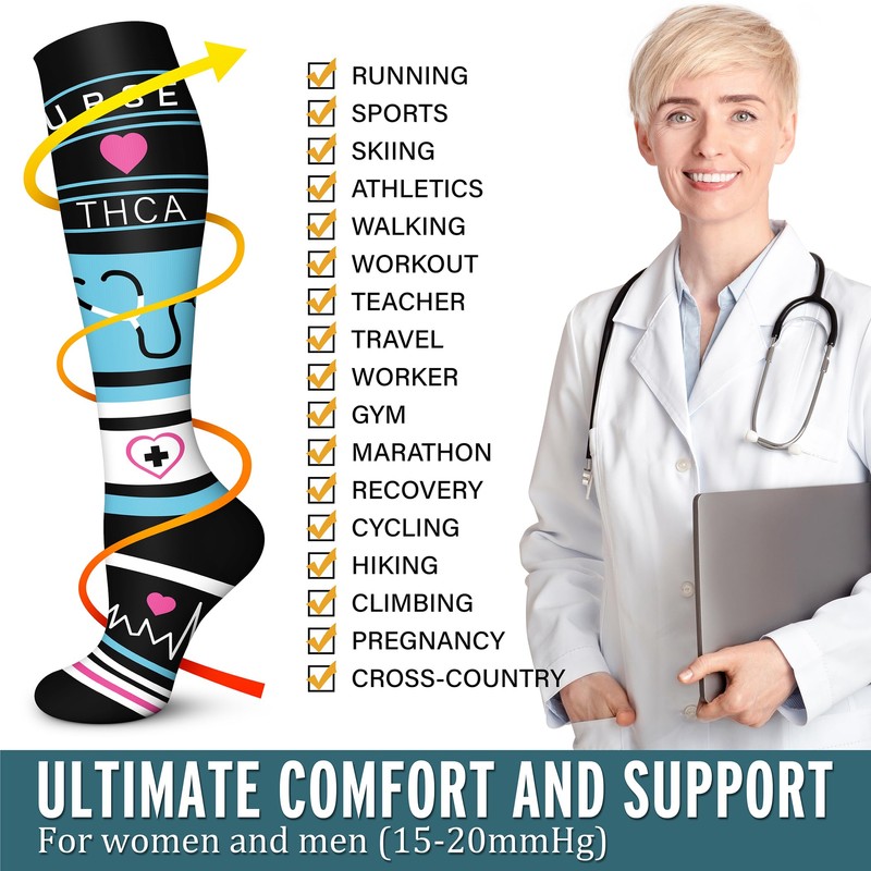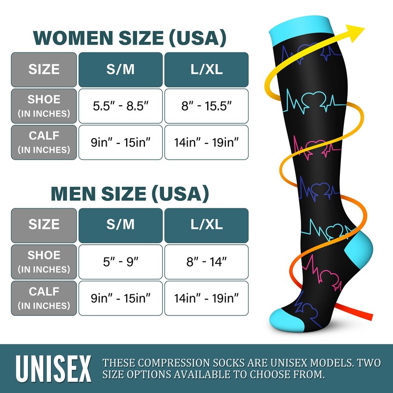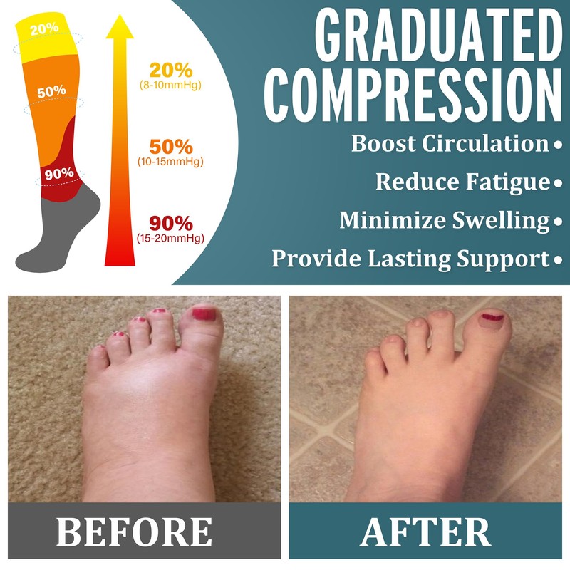 • MULTI-PURPOSE: Our Graduated Compression Socks put pressure in just the right spots, work by creating a "pressure gradient"(using graduated compression of 15-20 mmHg) which helps to push oxygen-poor blood out of the feet and legs, and back to the heart. Whether you are fitness enthusiasts, marathon enthusiasts, elderly people with swollen legs, office workers, teachers, crew members, pregnant women, parenting mothers, etc..