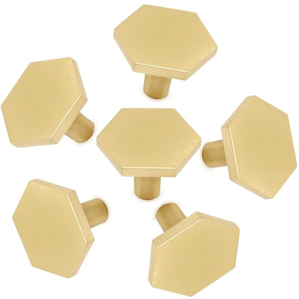 6 Pack Gold Hexagon Cabinet Knob Dresser Knobs 1.2" Diameter Brushed Brass Drawer Knobs Zinc Alloy Pull Handle Knobs for Bathroom Kitchen Cupboard Furniture Hardware