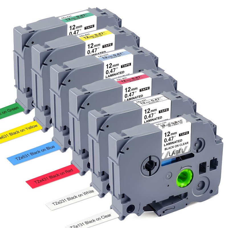 - Package Includes: 6-Pack Replacment for Brother label maker tape. P Touch TZe-131 TZe231 TZe431 TZe-531 TZe-631 TZe-731 label tape.Color: Black Text on Clear/White/Red/Blue/Yellow/Green Background