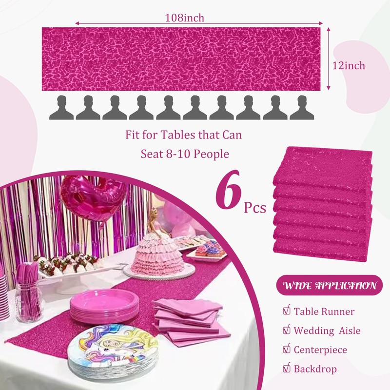 6 Pack Sequin Table Runner Sequin Table Cloths 12" x 108" Sparkle Table Runner Sequin Runners for Baby Bridal Shower Wedding Birthday Party Table Decor (Hot Pink)