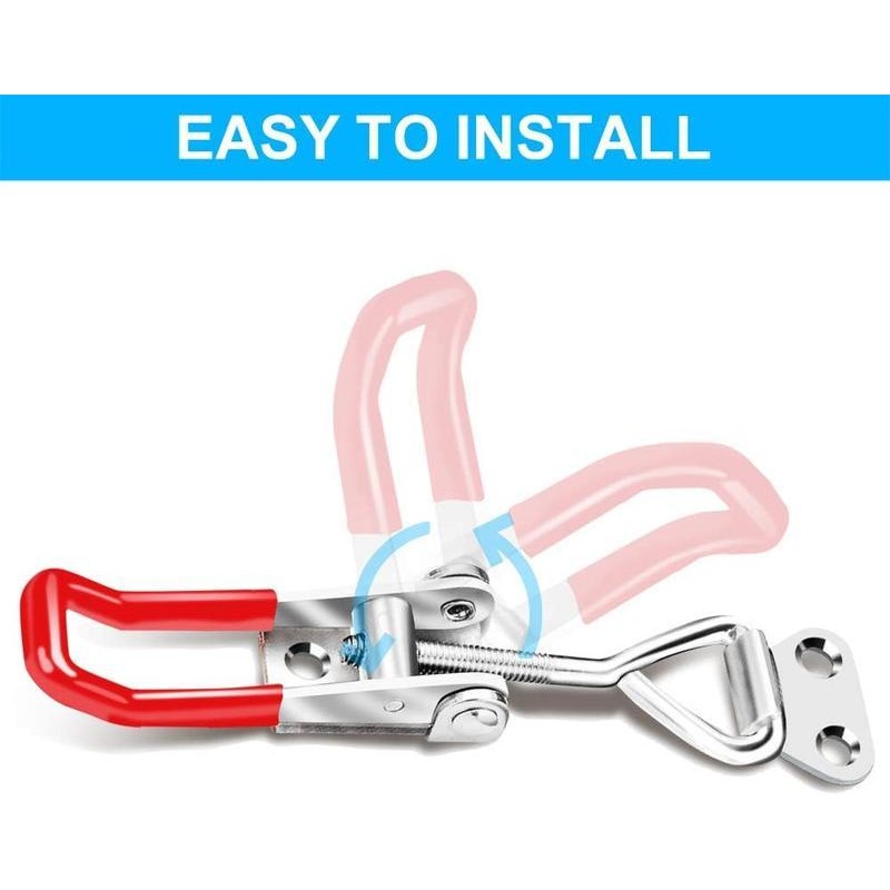 • EASY TO INSTALL & ADJUSTABLE DESIGN: toggle latch clamp are easy to install, just fix them with screws. The installation distance is adjustable, the maximum overall length is 4-1/8‚Äù, and the lock-up range is from 3-1/2 to 4-1/8 inches long. Use them to keep two halves closed tightly or loosely as you like. Just adjust the bolt and you will get the maximum tightness. MORE STURDY & ANTI-RUST: toggle clamp latch is made of premium metal plating zinc for corrosion resistance, and anti-rust. Works well for different temperature environments, indoor or outdoor. A soft plastic-covered handle makes you more secure and comfortable when using. STRONGER HOLDING POWER: heavy duty toggle latches are made of the highest quality metal materials and advanced technology, and enough strength to hold 330lbs(150kg). Stronger than most 4001 latch in the market. Each clip holds amazing tension until it is released, perfectly suited to your different needs. WIDELY USED: adjustable toggle latch perfectly fits the freezer door, cabinet doors, garbage cans, table leaf, storage box, tool boxes, cases, smoker lid, sliding doors, trailer tailgates, etc. Our clamps are a great helper for you in making jigs, tool fixtures, work fixing, connecting moving parts, and tensioning two sections. GREAT VALUE PACK: You'll get 6 Pack adjustable toggle clamp latch and 24PCS screws.