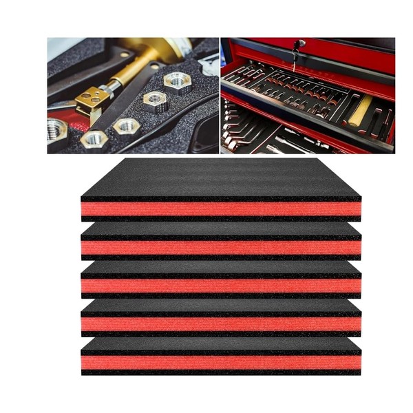 - 6-Piece Toolbox Foam Set: This set includes 6 polyethylene tool foam sheets, each measuring 18x12x1.5 inch (45cm x 30 cm x 1.8 cm). The drawer liner foam is perfect for lining your toolbox to provide cushioning and protection for your tools and collectibles. Color: Black with Red accents.