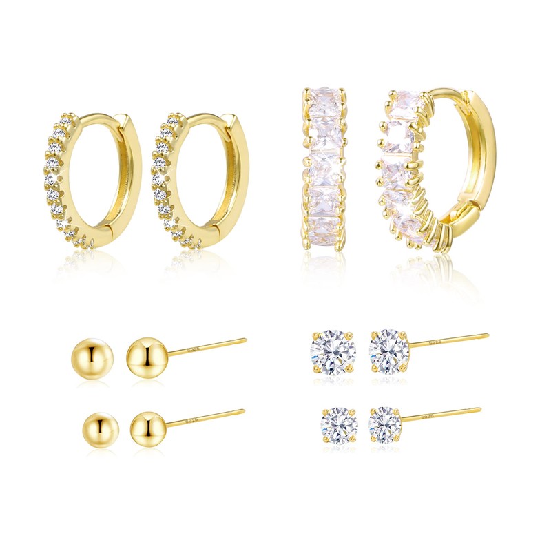 1. Includes 4 pairs of studs earring sets for multiple piercing and 2 pairs small huggie hoop earrings. 14K gold plated, inlaid with cubic zirconia. Nickel-free, lead-free and hypoallergenic long-lasting finish. Sensitive skin can also be used.
