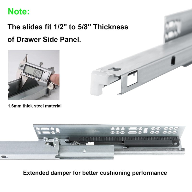 - ★ 6 pairs of 18inch,mounting screws,12 locking devices and instructions are included.Note:The maximum thickness of the drawer side panel would be 5/8''(16mm).