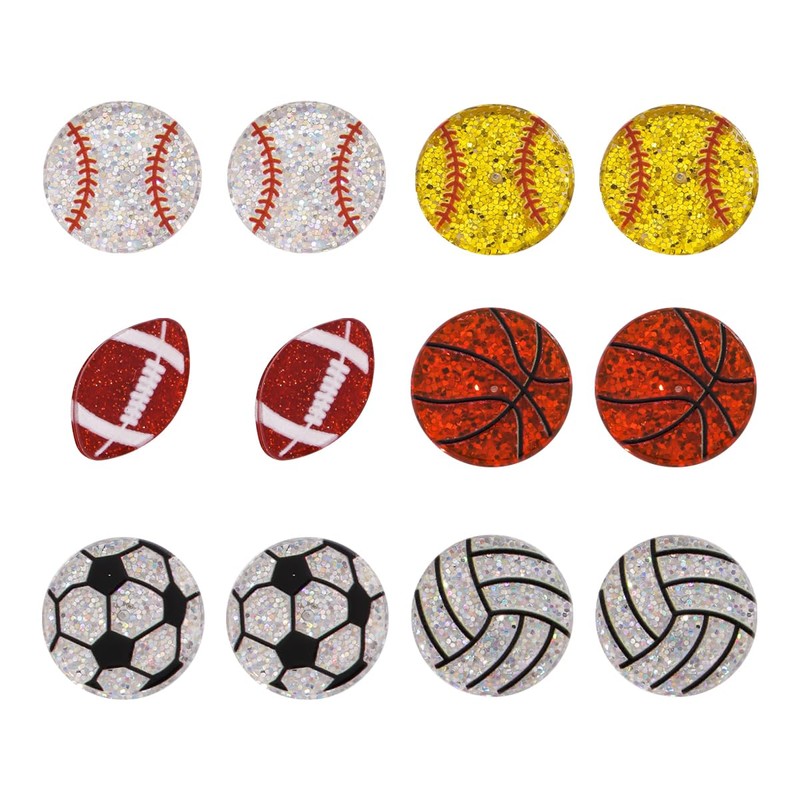6 Pairs of Sports Ball Stud Earrings Set for Women, Acrylic Sequin Game Ball Basketball Football Tennis Volleyball Earrings for Sports Theme Game Day Jewelry Accessories