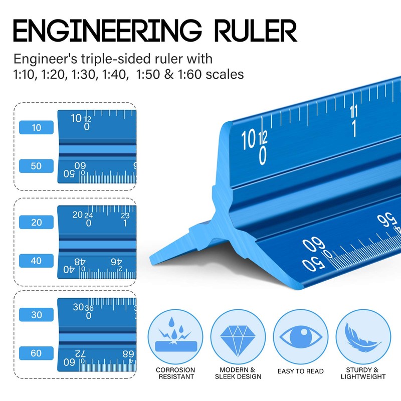 - Variety of scales: triangular drafting tool has 3 sided imperial scales: 1:10, 1:20, 1:30, 1:40, 1:50, 1:60 (engineer) and 1-1/2 inch, 1, 3/4 inch, 3/8 inch, 3/16 inch, 3/32 inch, 1/2 inch, 1/4 inch, 1/8 inch, 3 inch, 16 inch (architect), the 12-inch steel ruler has imperial and metric scales; All numbers and measurement markings on drafting scale rulers are etched for maximum clarity and readability, not easy to wear or fade