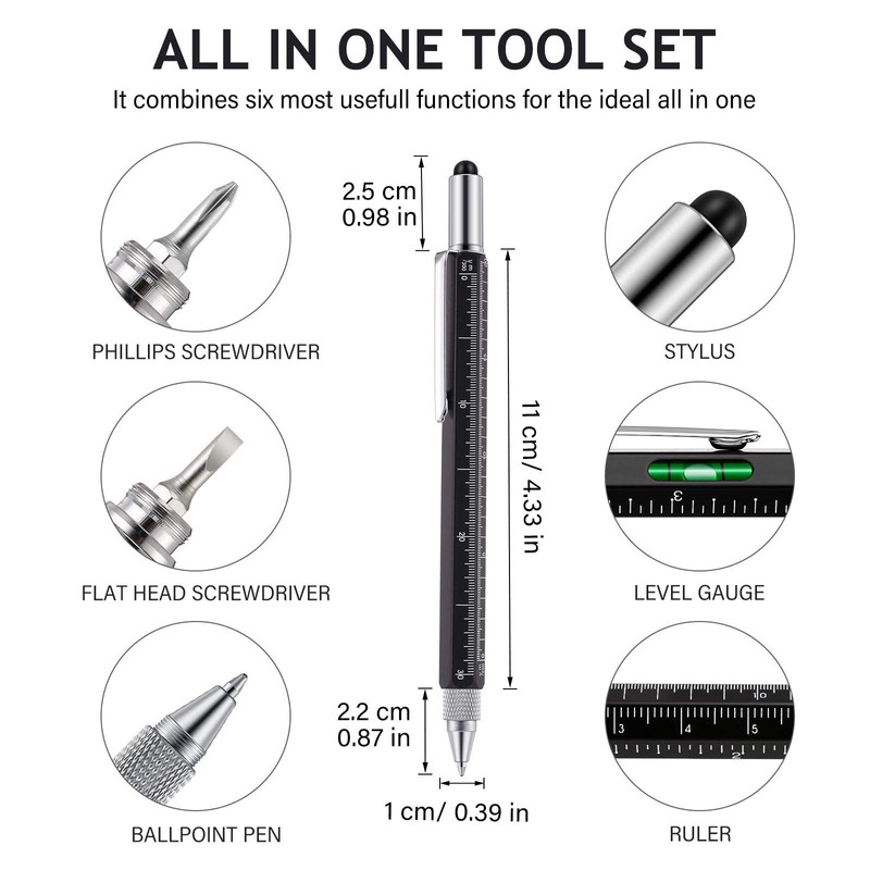 - Multitool pen: 6 in 1 tech tool pen is made of extra strong aluminum in fine workmanship, the gadgets pen comes with 6 very handy functions, including ruler, touch screen stylus, ballpoint pen, spirit level and both flat head and cross screwdrivers; This pen combines most of useful functions into one