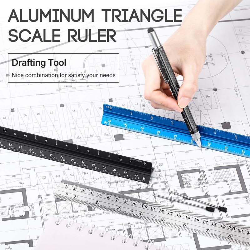 - What you will get: package includes a black architect scale ruler, a blue engineer scale ruler, a 12-inch/ 300 mm standard stainless steel ruler, an aluminum multitool pen and 2 extra black ink refills