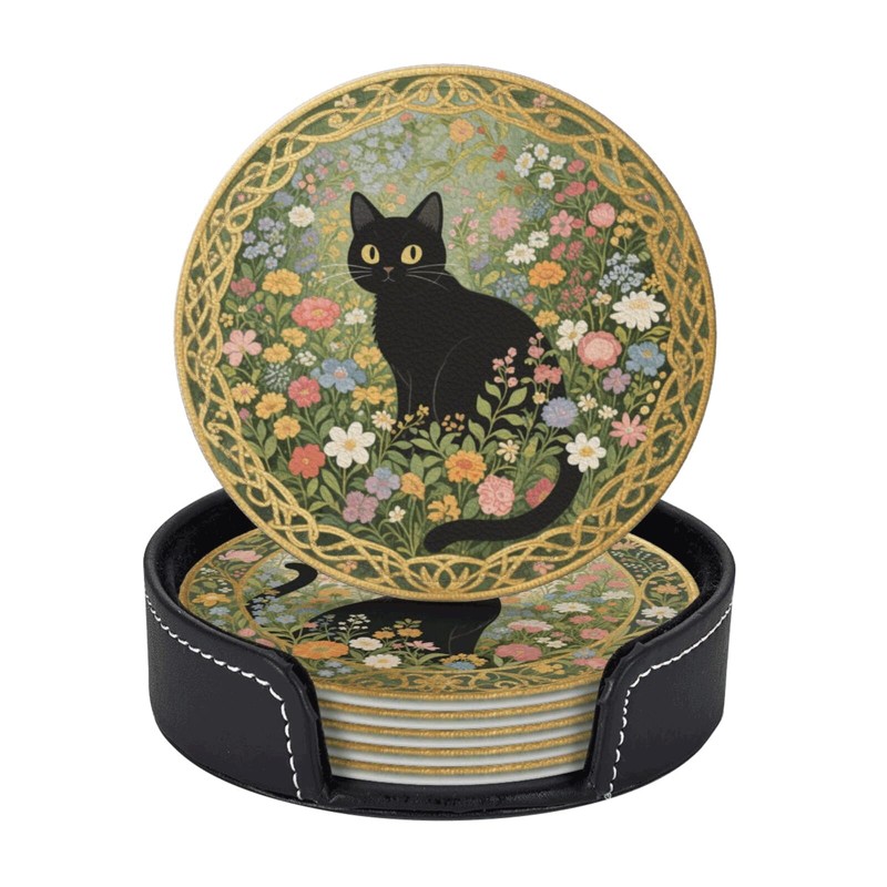 6 Pcs Black Cat Flower Drink Coasters with Holder Coasters for Drinks Coffee Table Home Decor Housewarming Gift
