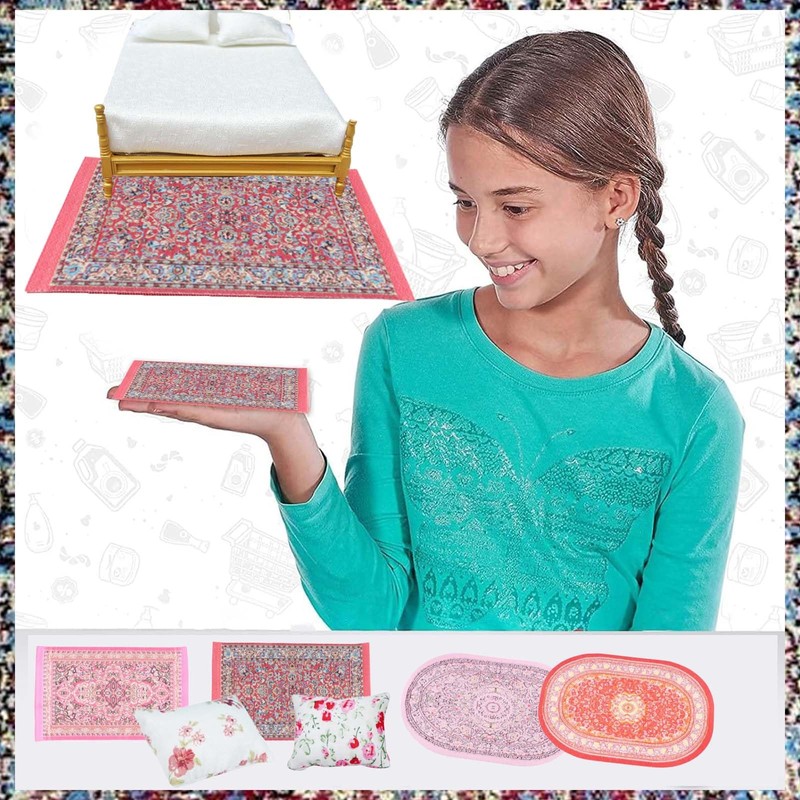 - Complete dolls house furniture:Includes 4 miniature carpets designed specifically for dollhouses and 2 pillows;Very suitable for enhancing the realism of dollhouse living rooms,bedrooms,and other spaces;Suitable for kid and miniature model enthusiasts