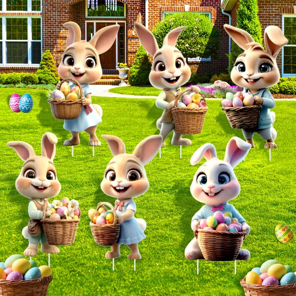 6 PCS Easter Yard Decorations Easter Bunny Yard Signs Easter Yard Stakes Cute Bunny Rabbits Yard Signs with Stakes for Happy Easter Party Spring Lawn Garden Signs Family Home Outside Decor Supplies