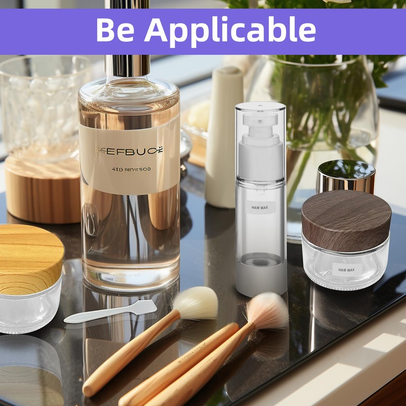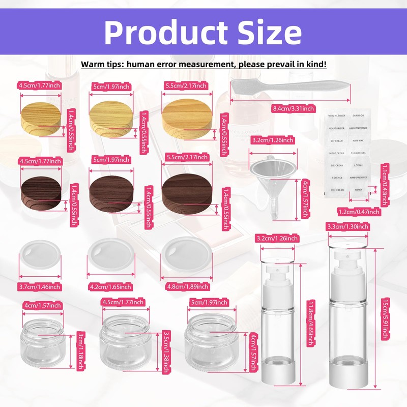 - Package contents: 3 Pcs (20ml+30ml+50ml, light wood grain lids Glass) and 3 Pcs (20ml+30ml+50ml, dark wood grain lids Glass), 2 vacuum spray bottles (30ml+50ml), 2 transparent spoons, PP funnel, and English labels, for a total of 12 Pcs