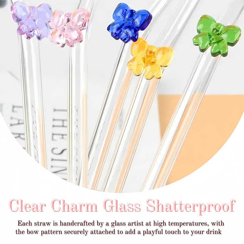 6 PCS Glass Straws Reusable,Glass Straws with Charms,Bent Straws with Cleaning Brushes,Clear Glass Straw with Bows,Butterfly Straws,Glass Butterfly Straws,Long Glass Straw,Glass Drinking Straws