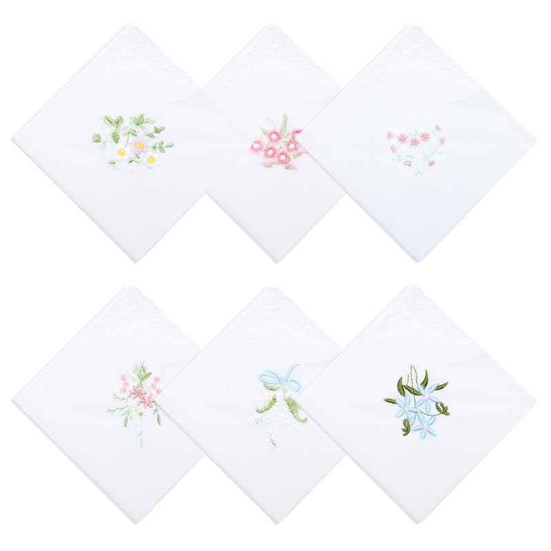 6 Pcs Ladies Handkerchiefs 100% Soft Cotton with Satin Border and Matching Floral Embroidery Lace Handkies Durable Easy Clean for Woman Girls Wedding Party Prom Celebrations Birthday Gifts (28x28cm)