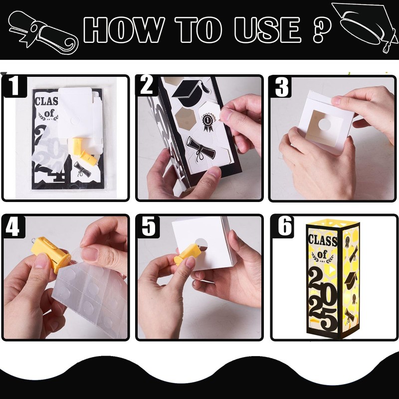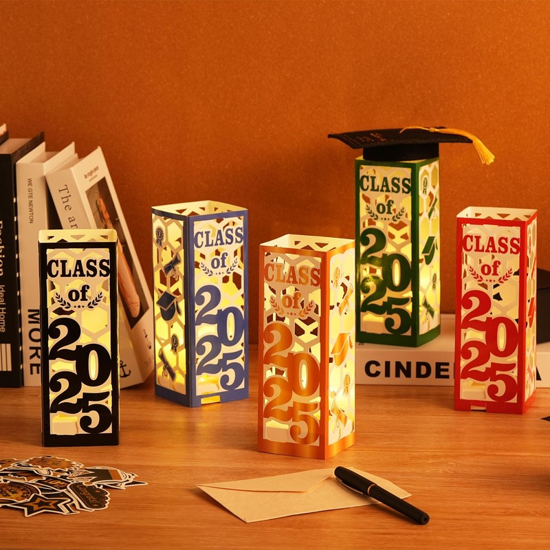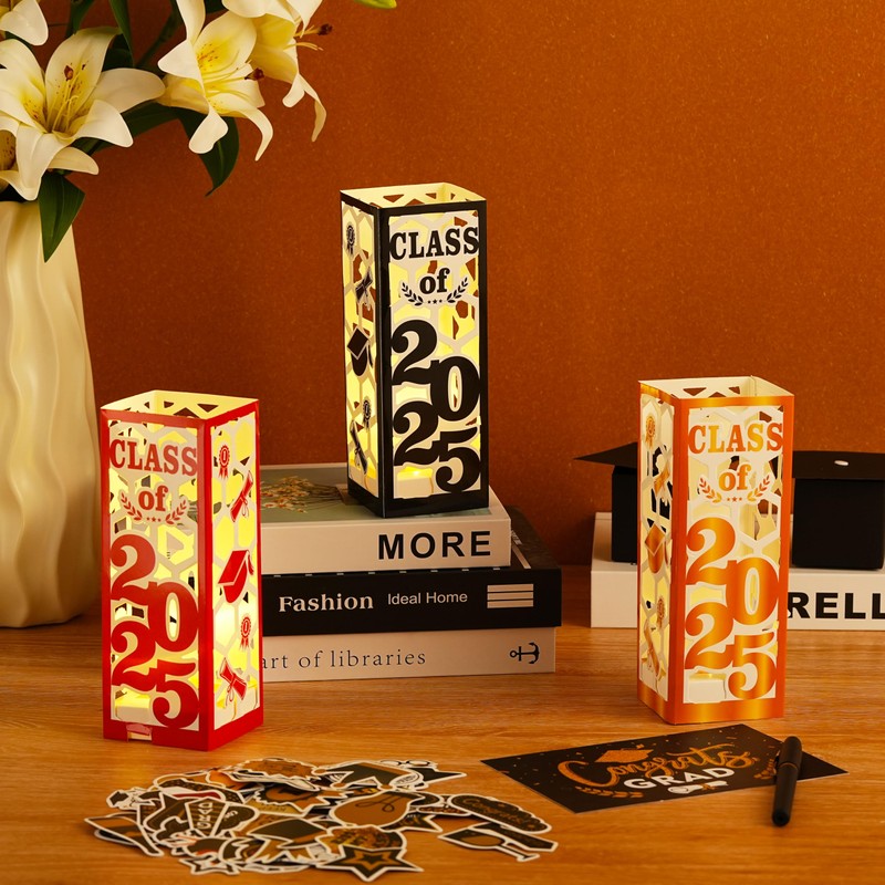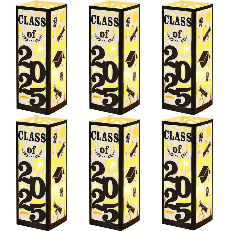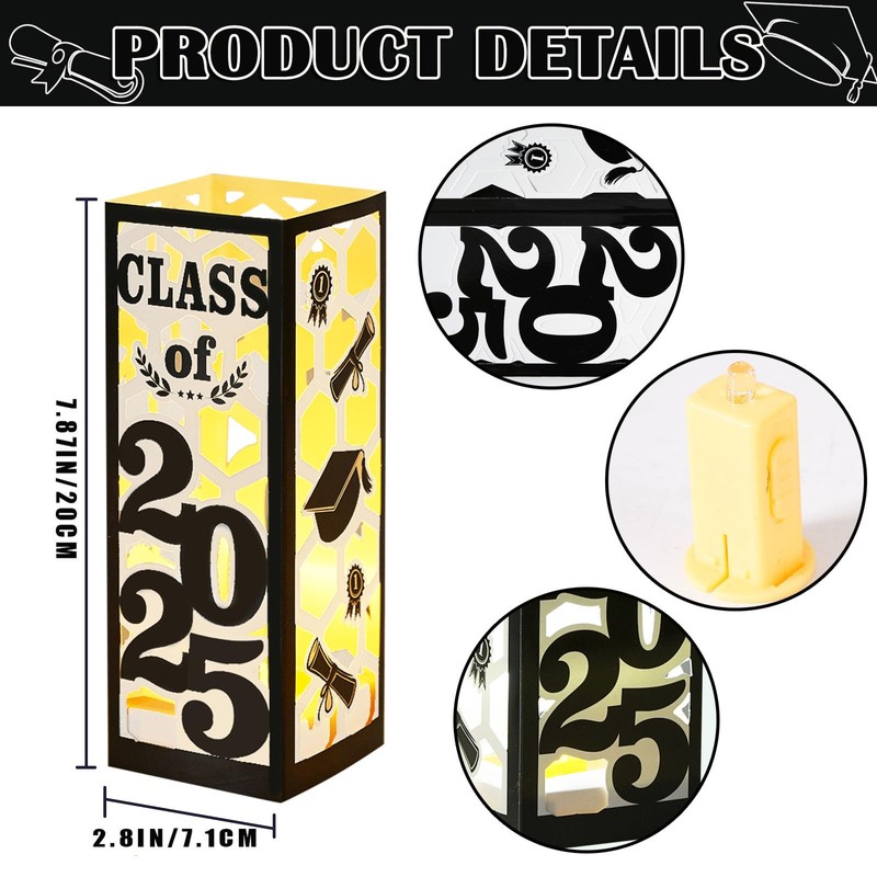 - đăGraduation Decorations SetăYou will get 6Pcs graduation table centerpieces boxes, 6pcs led lights. Each one with letter "Class of 2025", a height of about 7.8 inches and a width of about 2.8inches. Brighten your special day with these decorations that will impress