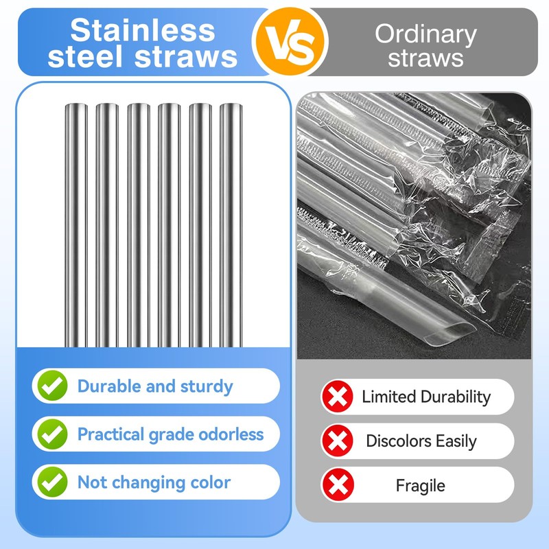 - High-Quality Food-Grade Material: Made from high-quality stainless steel, these straws are BPA-free, lead-free, dishwasher safe, colorfast, and reusable—offering a safe, eco-friendly, and plastic-free alternative with no metallic aftertaste. Compared to plastic straws, these stainless steel straws are stronger, more durable, resistant to discoloration, and built to last. They can be cleaned in the dishwasher or washed by hand for your convenience.