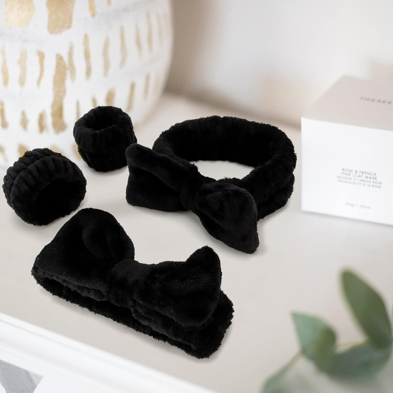 6 Pcs Spa Headband and Wristband Set, Multicolour Microfiber Fleece with Bow Design (Balck, One Size)