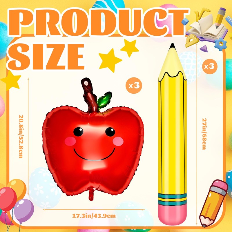 • Product Include and Size:You will receive three apple-shaped balloons and three pencil-shaped balloons. The size of each apples balloon is about 20.8×17.3 inches, and the size of each pencil balloon is about 27 inches. The right size can make your party more dazzling