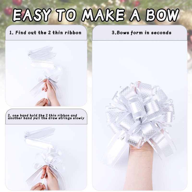 - EASY TO USE: Each pull bow consists of 8pcs of small bow parts which are firmly fixed by plastic rings. After open the bows, you can find out 2 thin ribbon strings and pull them slowly, then take a knot and then a beautiful ribbon bow is finished. (You can follow the steps in the assemble photo .)