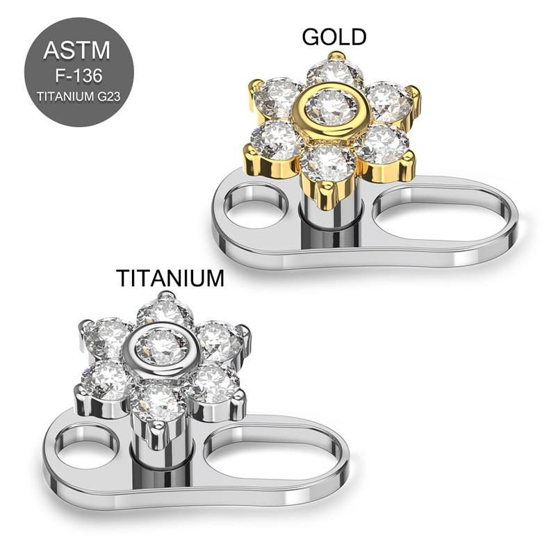 • 6 Petals Flower Cz Stone Gold Anodized Stainelss Steel Top G23 Grade Titanium Internally Micro Dermal Anchor Piercing Jewelry. Made from G23 Grade Titanium with 316L Surgical Steel and Cz Stone , this dermal anchor is the perfect piercing to wear everyday, a comfortable fit that will help give you that extra sparkle daily