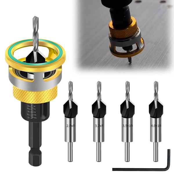 6-Piece Countersink Drill Bit Set, Pre-Drilling and Countersinking in One Step, with Depth Stop, 1/4 Inch Hex Shank, HSS-M2, for Precise Wood Drilling