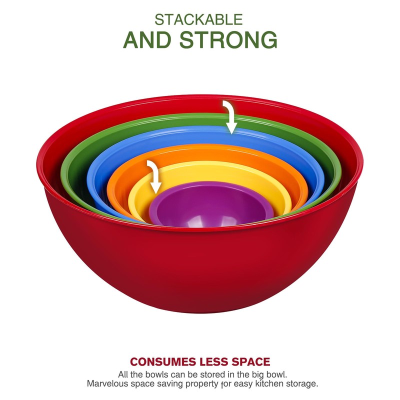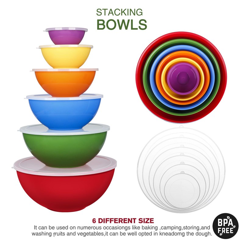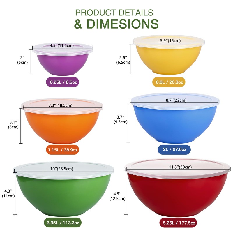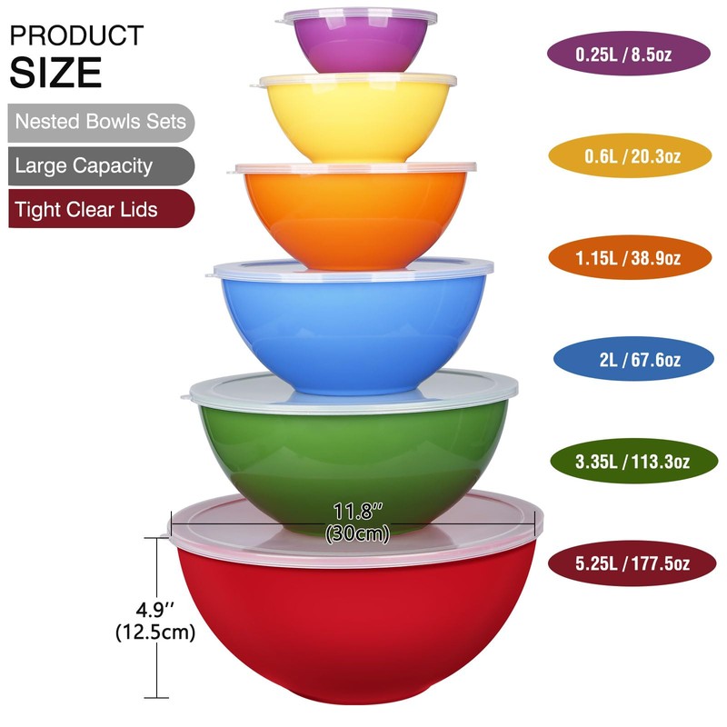 - 🍓【A Variety of Sizes】: This nesting bowl set is fit for all your prep and storage needs, such as mixing batter, storing leftovers, tossing salad, or marinating. The set includes 6 plastic bowls with 6 transparent lids in multiple sizes: 0.25L, 0.6L,1.15L,2L,3.35L and 5.25L.