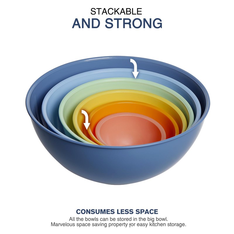 - 🍓【Stackable & Easy to Clean】: These nesting mixing bowls for kitchen can be stacked on top of each other to save space. The plastic bowls with lids are top-rack dishwasher friendly and can also be hand washed with soap and water (avoid the use of abrasive sponges).