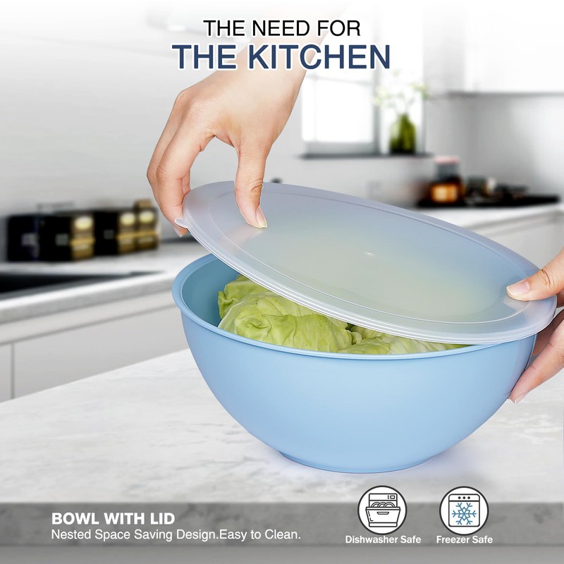 6-Piece Plastic Mixing Bowl Set with Lids for Kitchen, Nesting Storage Bowls for Baking, Prepping,Cooking and Serving Food, Dishwasher, Microwave Safe,Great for Mixing & Serving,Light blue