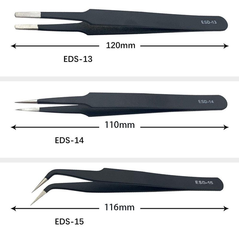 - Antistatic - The kit is designed to meet the requirements of electronics. Each tweezers are coated with a resistive ESD coating that prevents static damage to electronic components. The resistive ESD coating protects the electronics from static charge.