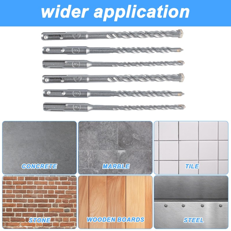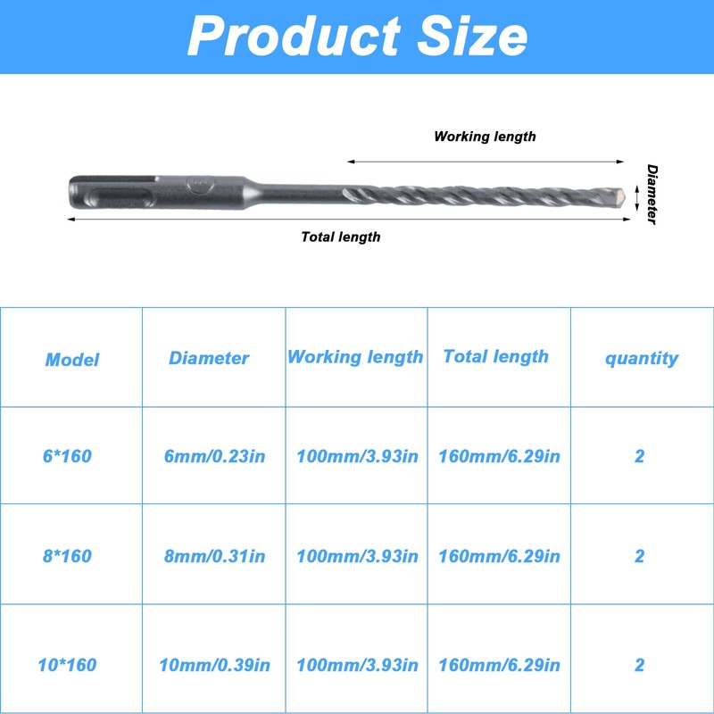 - Package Includes: A total of 6 pcs SDS plus hammer drill bits, 3 sizes, 2 pieces of each size, sizes include: 10x160mm, 8x160mm, 6x160mm, to meet the use needs of multiple materials and multiple fields