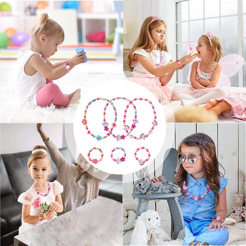 Pack of 6 children's jewellery, wooden children's jewellery set, jewellery girls necklace bracelet children, unicorn bracelets girls, colourful beads friendship bracelet for girls, birthday party dress up costume accessories.