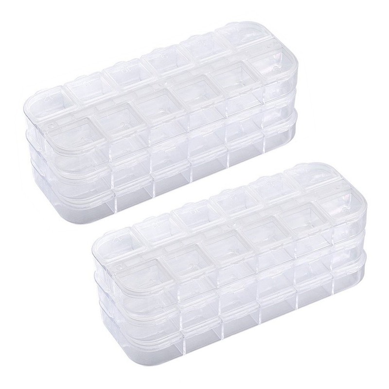 6 pack 12 compartments plastic nail tool jewelry storage box. **Feature:** Each small lattice has a lid for easy classification and storage. Transparent design for a clear view to the contents. Perfect for storing false nail tips, glitters, rhinestones. Detachable lid to secure an extra convenience and versatile usage. **Specification:** Material: PS plastic. Color: transparent. Product Function: storage, rhinestone painting accessory. Box Size: 5.1 x 2 x 0.6 in / 13 x 5 x 1.5 cm.Small grid size: 2 x 2 x 1.2 cm. **Package Included:** 6 x Jewelry storage box