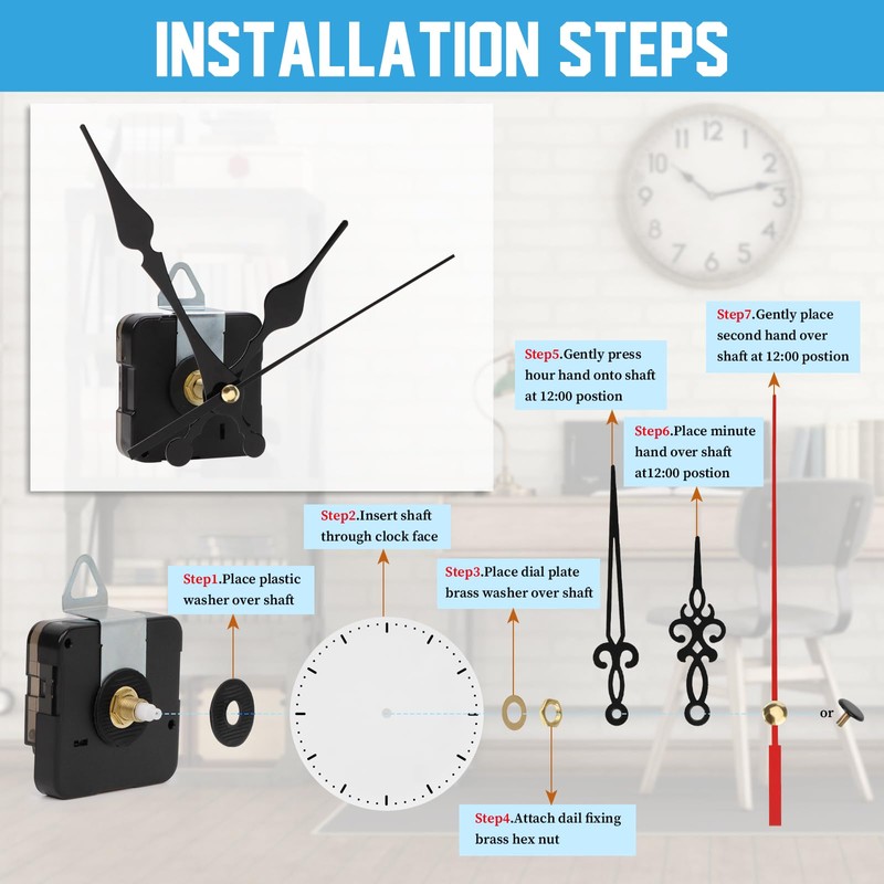 - Easy installation: the clock movement with hand is carefully designed and the internal components fit precisely to ensure smooth installation. Simply align the hands one by one, turn the small gear on the back to adjust the time, install the battery and the installation is complete.