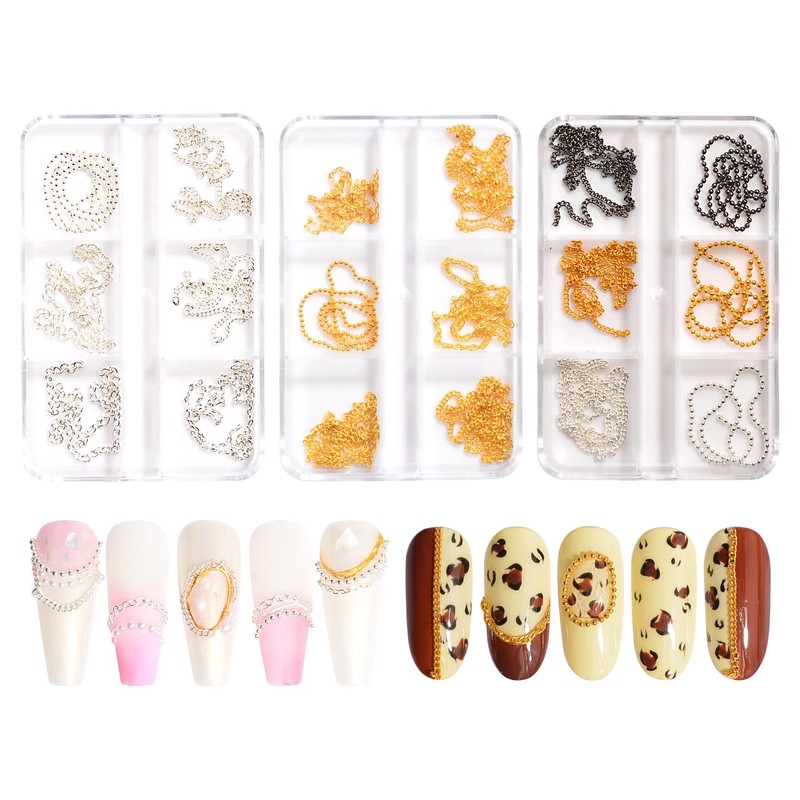 - PACKAGE INCLUDED — 6 Strips metallic nail chains (comes in a acrylic box) , different styles can meet your different DIY needs, allow you to enjoy the fun of nail art. each length is about 21cm-25cm.