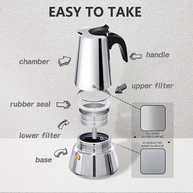 - [MATERIALES PREMIUM] - La cafetera de espresso está hecha de materiales de calidad de acero inoxidable 430 de grado alimenticio, por lo que tiene una fuerte resistencia a la corrosión y al óxido. Gracias a sus materiales es apto para lavarse en lavavajillas.