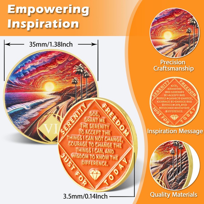 - Powerful Symbolism & Inspiration】 This 6 Year Sunset Coastal Road Sobriety Coin features a breathtaking coastal highway scene at sunset—symbolizing the journey of recovery, the beauty of progress, and the hope of each new day. Framed by the empowering Serenity Prayer, this AA Coin NA Medallion serves as a visual reminder to stay grounded in courage, wisdom, and acceptance.