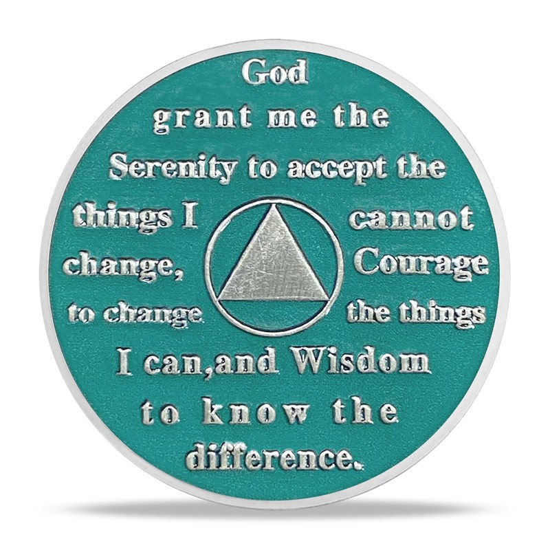The reverse side of aa sobriety chip engraves Serenity Prayer: "God grant me the serenity to accept the things I cannot change courage to change the things I can and wisdom to know the difference.